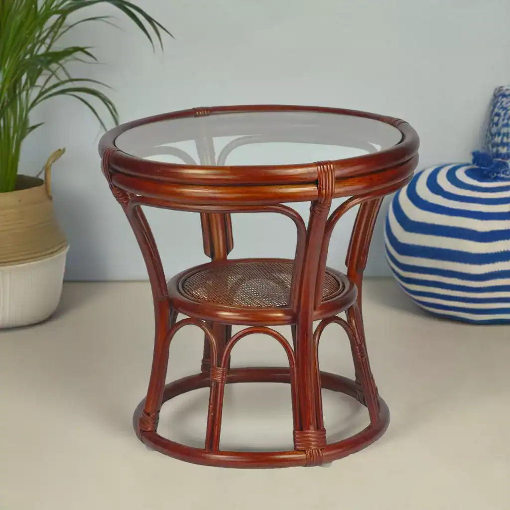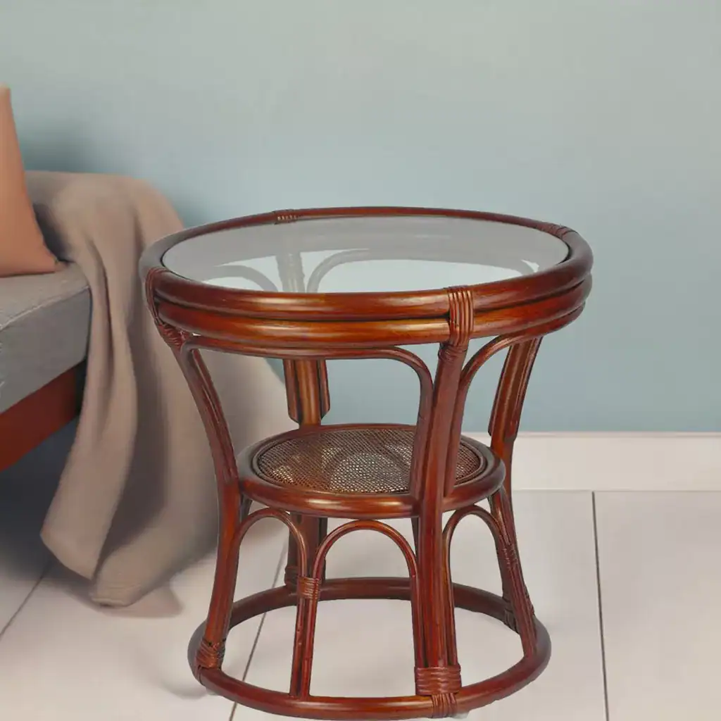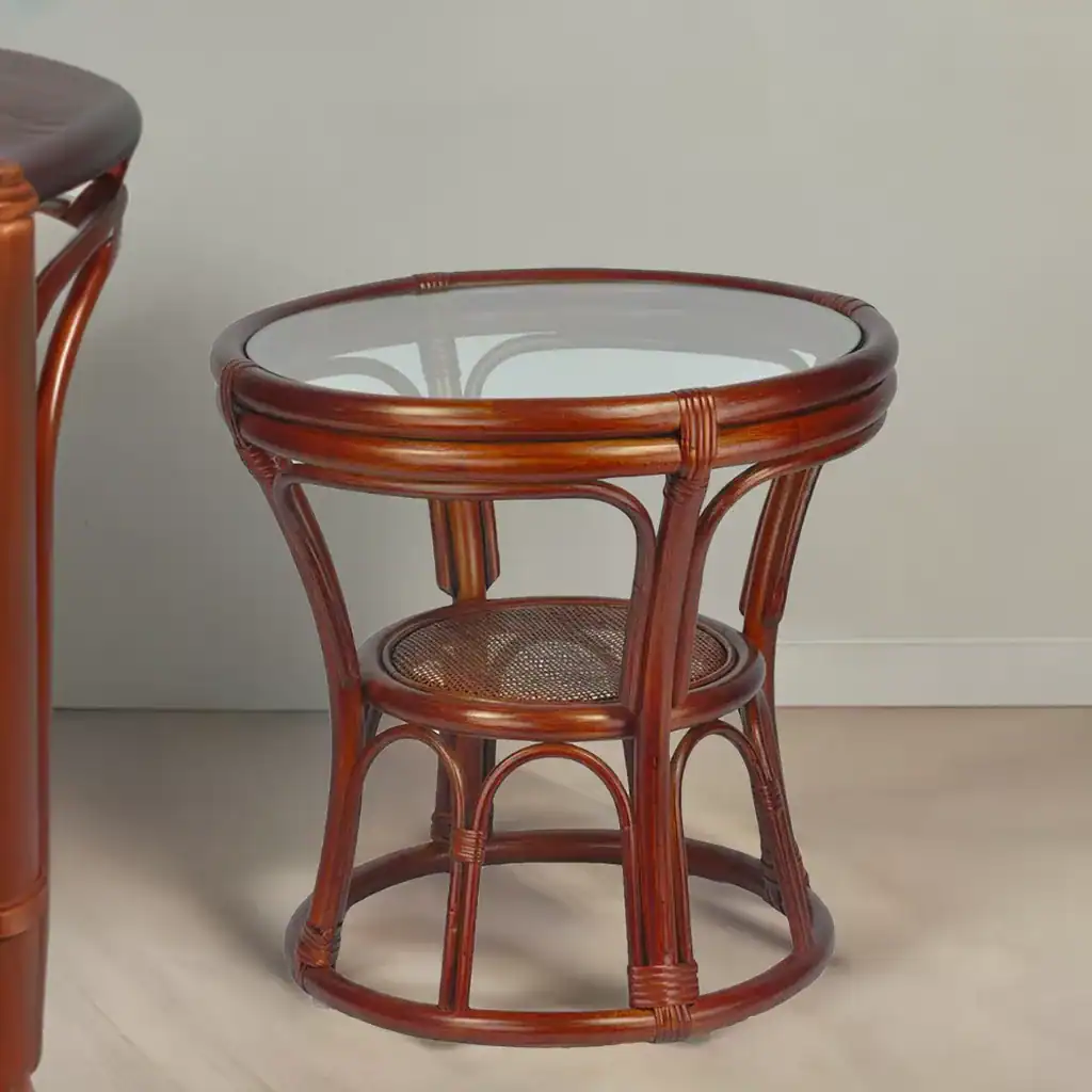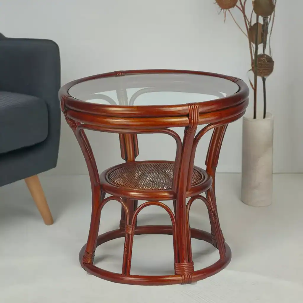 • Unikalny Design: Okrągły, szklany blat o średnicy 54 cm pięknie komponuje się z rattanową półką poniżej, oferując estetyczny i praktyczny element wnętrza.