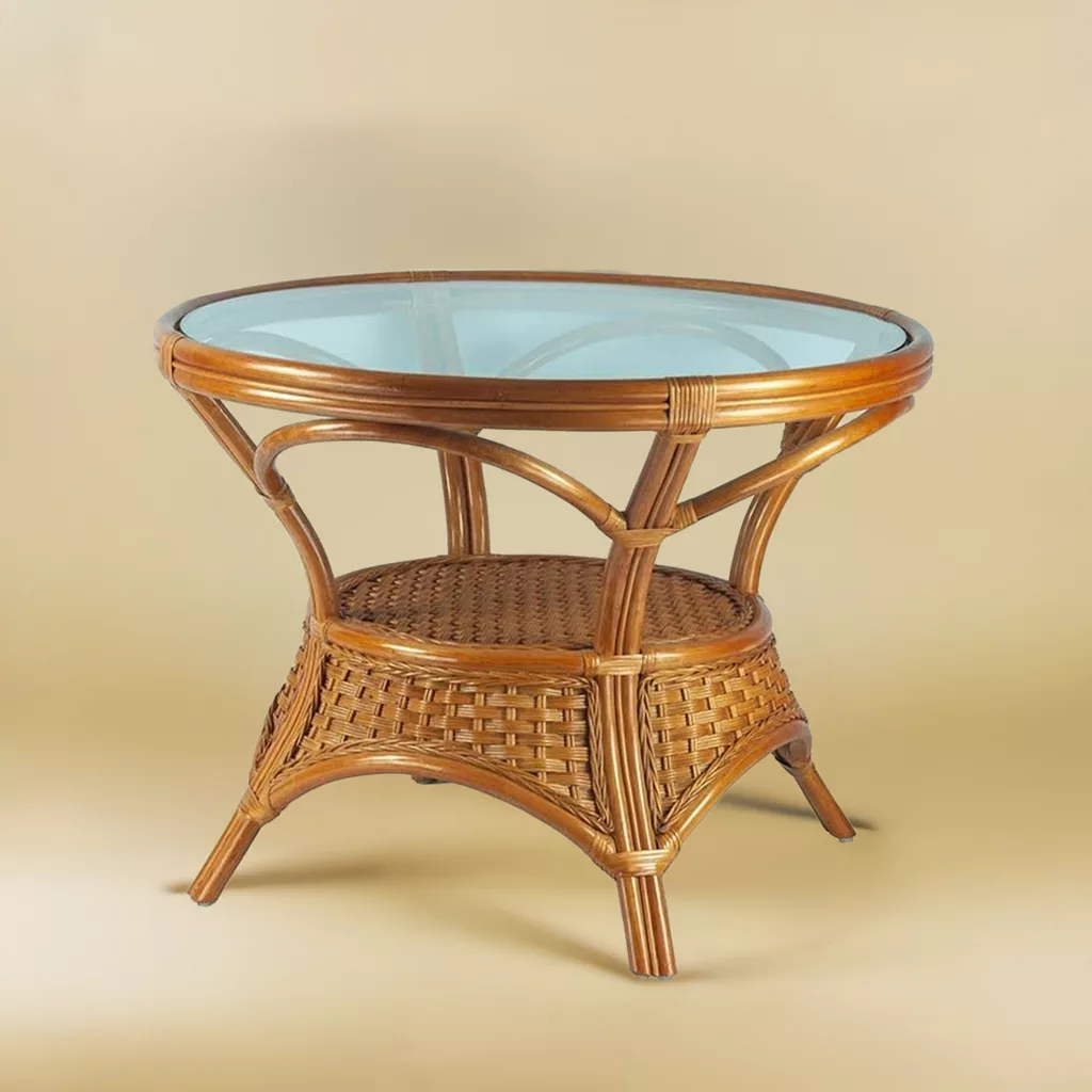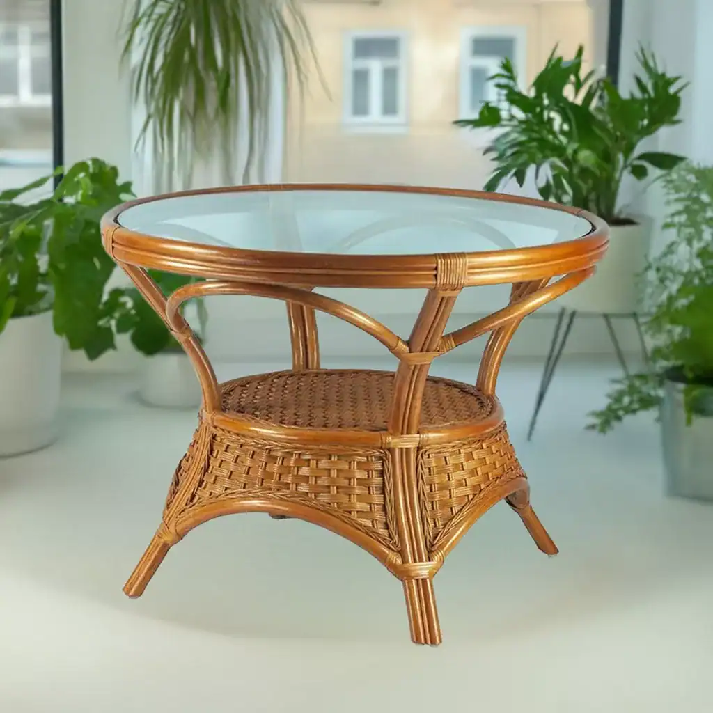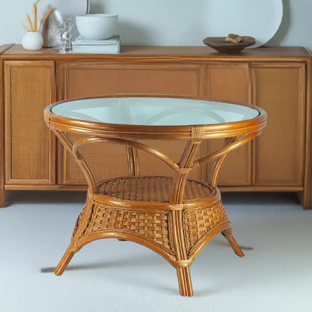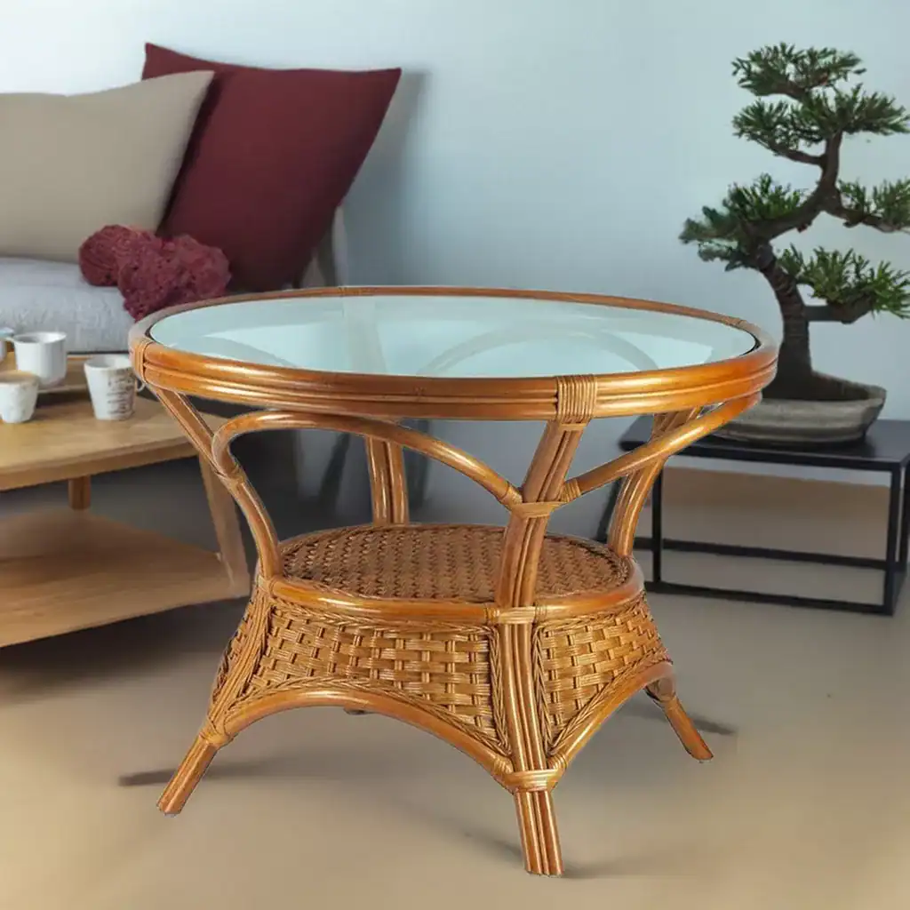 Discover the classic beauty and warmth that “RattaNeo Coral s137” brings – a table with cognac-toned natural rattan. This elegant piece of furniture, with a round glass top measuring 100 cm in diameter and a height of 76 cm, is more than just a dining table; it’s the heart of home warmth where family and friends gather. Precision-crafted by hand, each natural rattan table is a unique expression of craftsmanship, with an individual RattaNeo quality hologram ensuring authenticity and uniqueness. The cognac shade of the rattan adds a rich, warm atmosphere to the interior, creating a perfect backdrop for shared meals and conversations.