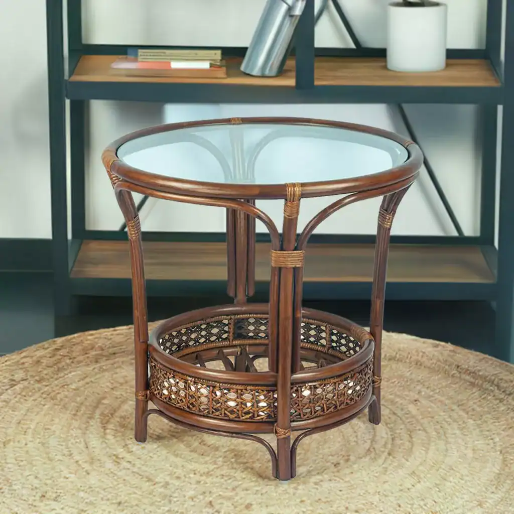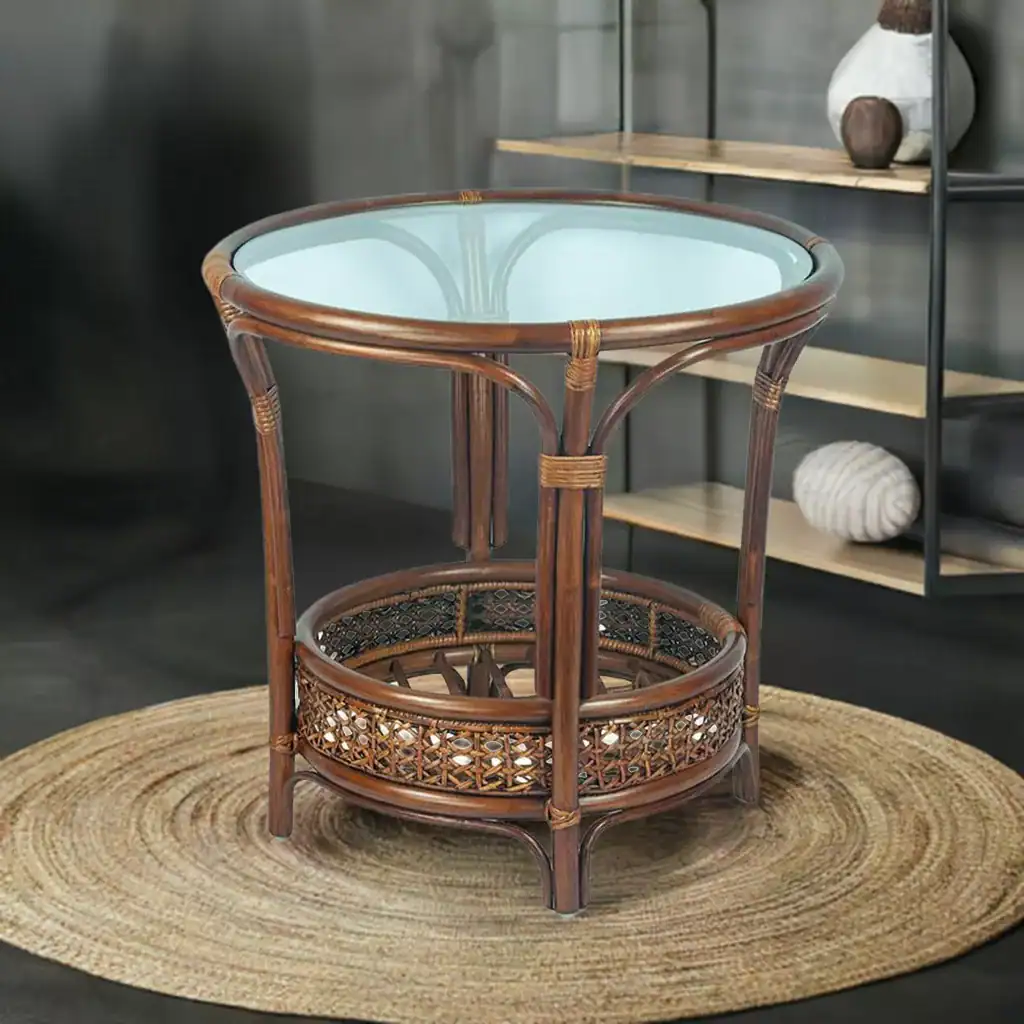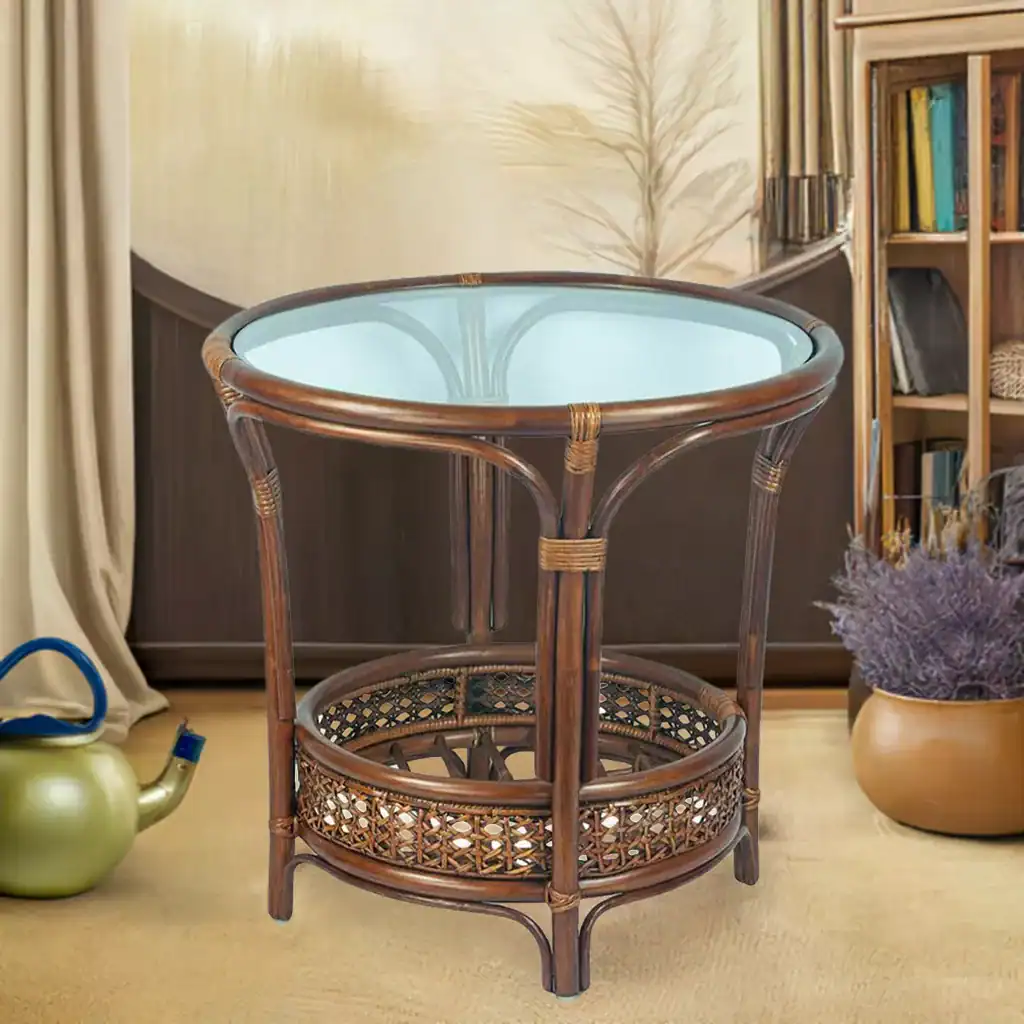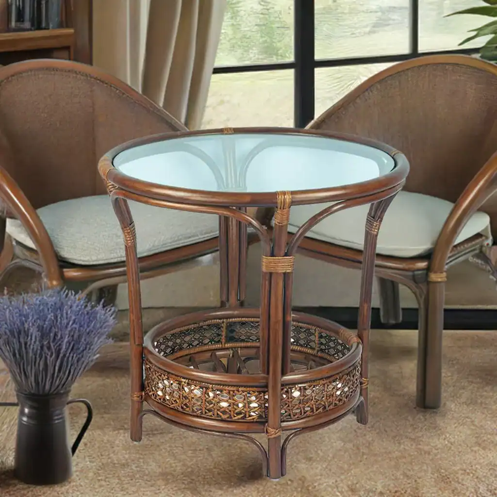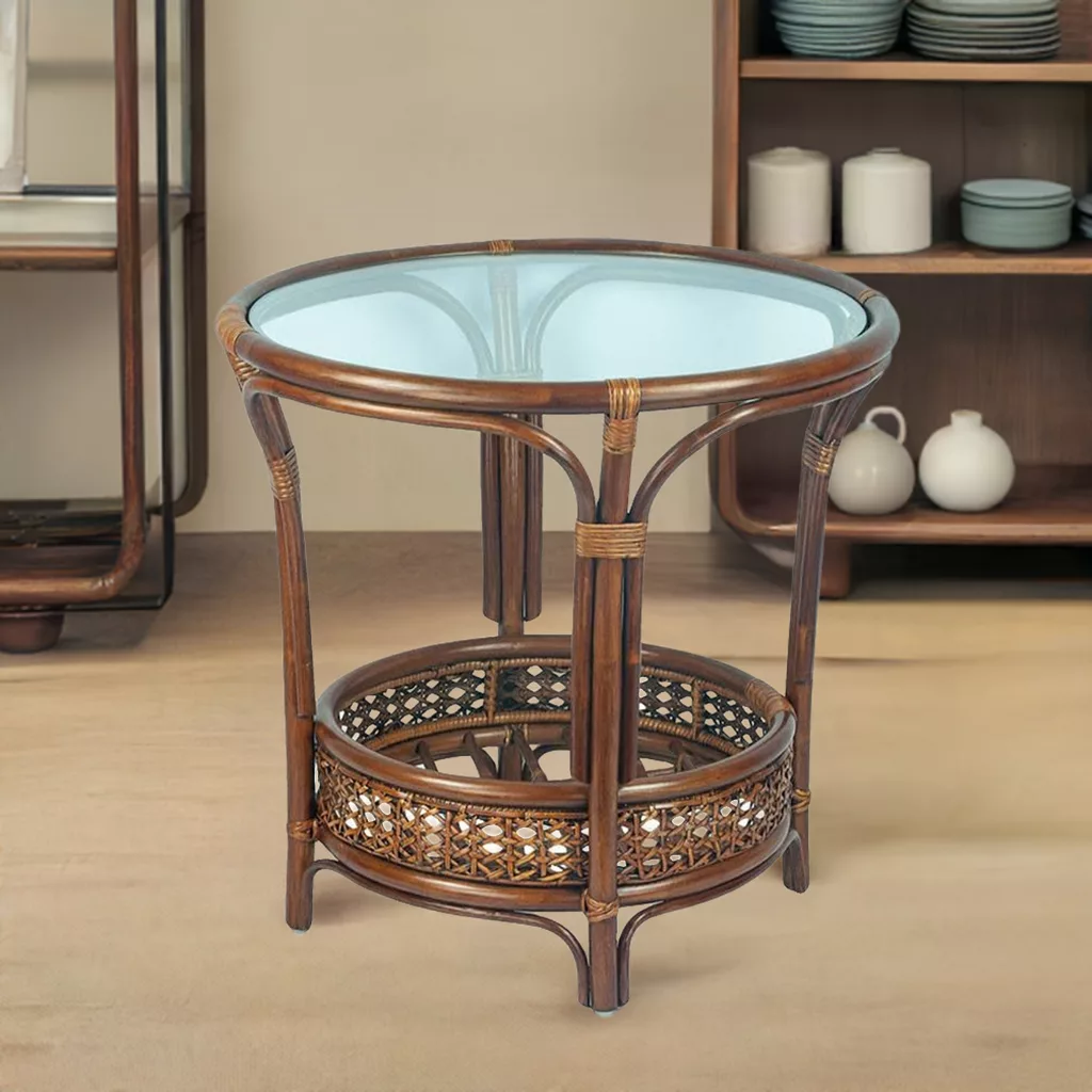 Made from natural rattan, this table exudes warmth and authenticity, bringing the essence of nature into your home. Its brown color blends seamlessly with various interior designs, from modern to rustic.